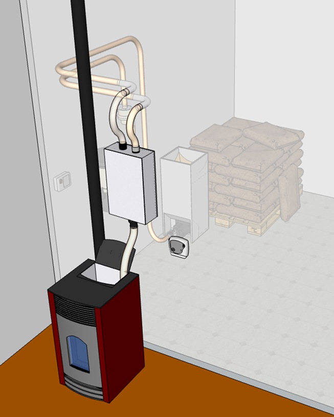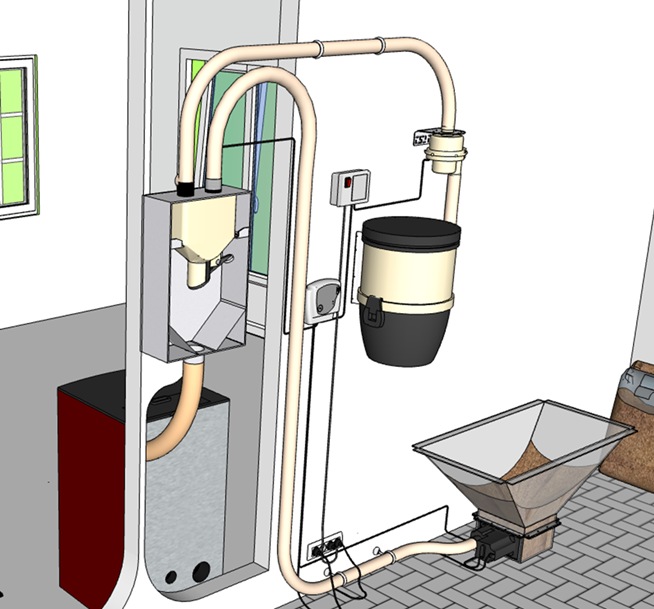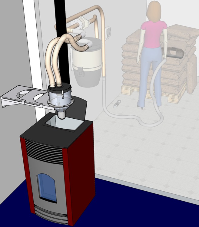 Un contrôleur spécifique pour les inserts est associé à une prise murale d’aspiration. La prise murale signale le besoin en pellet. Lorsque le flexible est inséré dans la prise, le contrôleur déclenche les cycles d’aspiration.