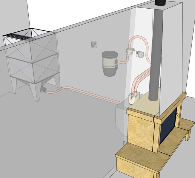| Exemple 1 - kit spécifique insert L'insertion du flexible d'aspiration déclenche la mise en marche de la centrale d'aspiration. Le contrôleur peut être à l'intérieur ou l'extérieur de la hotte. Avec pot à poussières ou rejet d’air vers l’extérieur. | Exemple 2- de transfert manuel vers une trémie de poêle Il est nécessaire d'ouvrir le capot de la trémie avant de procéder à la mise en marche du système. Le pot de décharge peut être positionné directement sur le couvercle de la trémie (à percer selon gabarit) ou sur une console fixée au mur ou sur le poêle. |