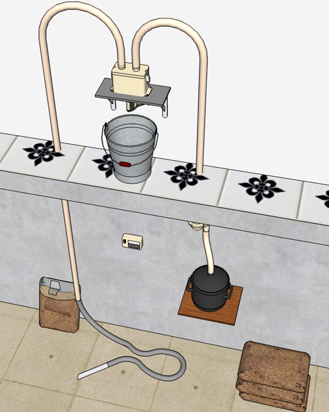 | Exemple 2 bis- transfert manuel avec levage vertical vers un récipient intermédiaire. Solution parfois adoptée lorsqu'il est impossible de positionner le doseur sur le poêle ou en proximité immédiate. | Exemple 2 ter- Extraction automatisée avec levage vertical vers une trémie de poêle Pot de décharge encastré - flexible de délivrance à amener dans la trémie avant de mettre en marche le système. |